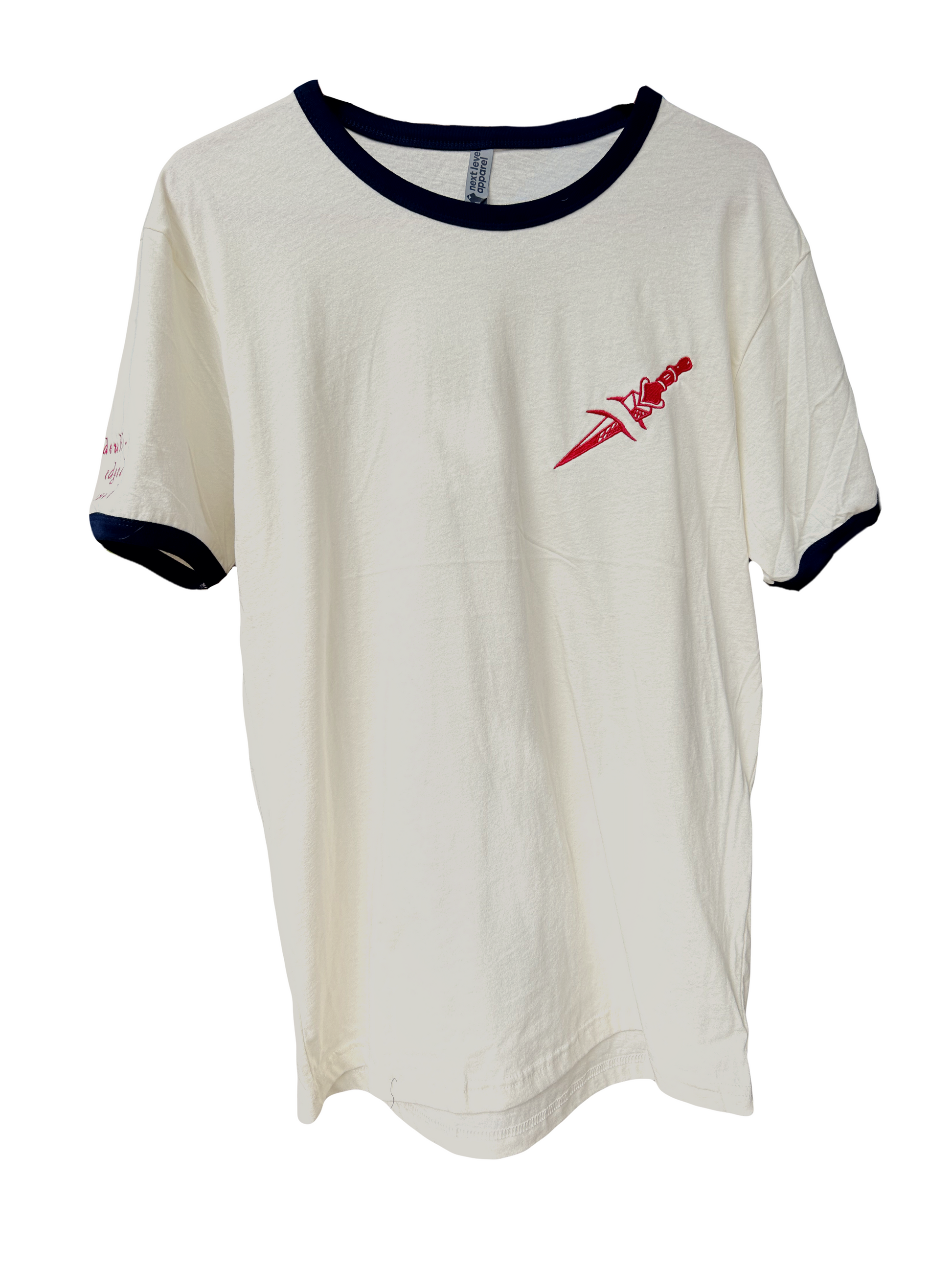 A nod to the notion that two things can be true at once. This super-soft, lightweight cream cotton ringer tee features a dark navy collar and sleeves, finished with red embroidery. On the left chest: my hand-drawn sword piercing through the tee. On the right sleeve: the phrase “Double-Edged Sword.” Inspired by my double name and the beauty of duality, this tee carries both comfort and meaning.