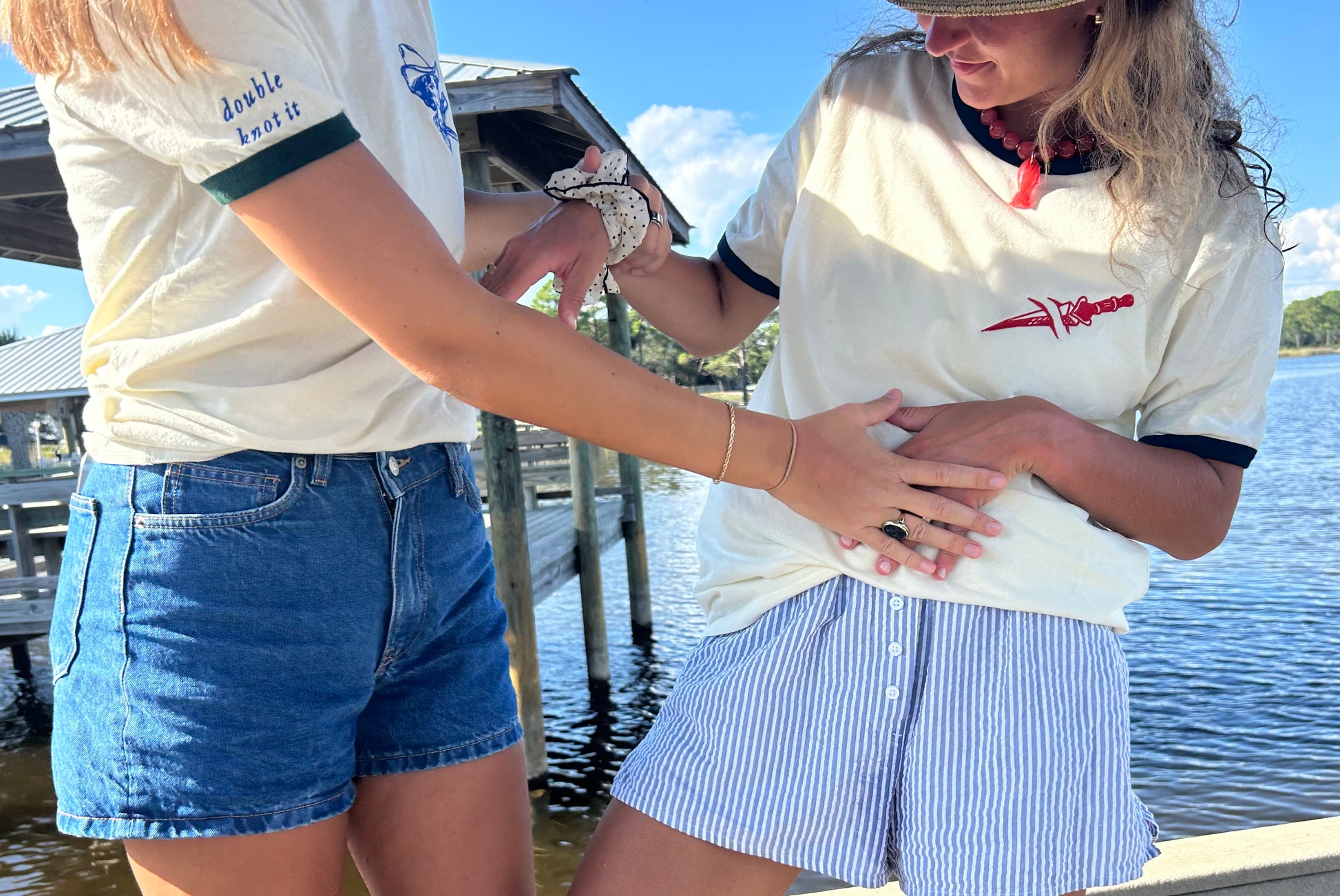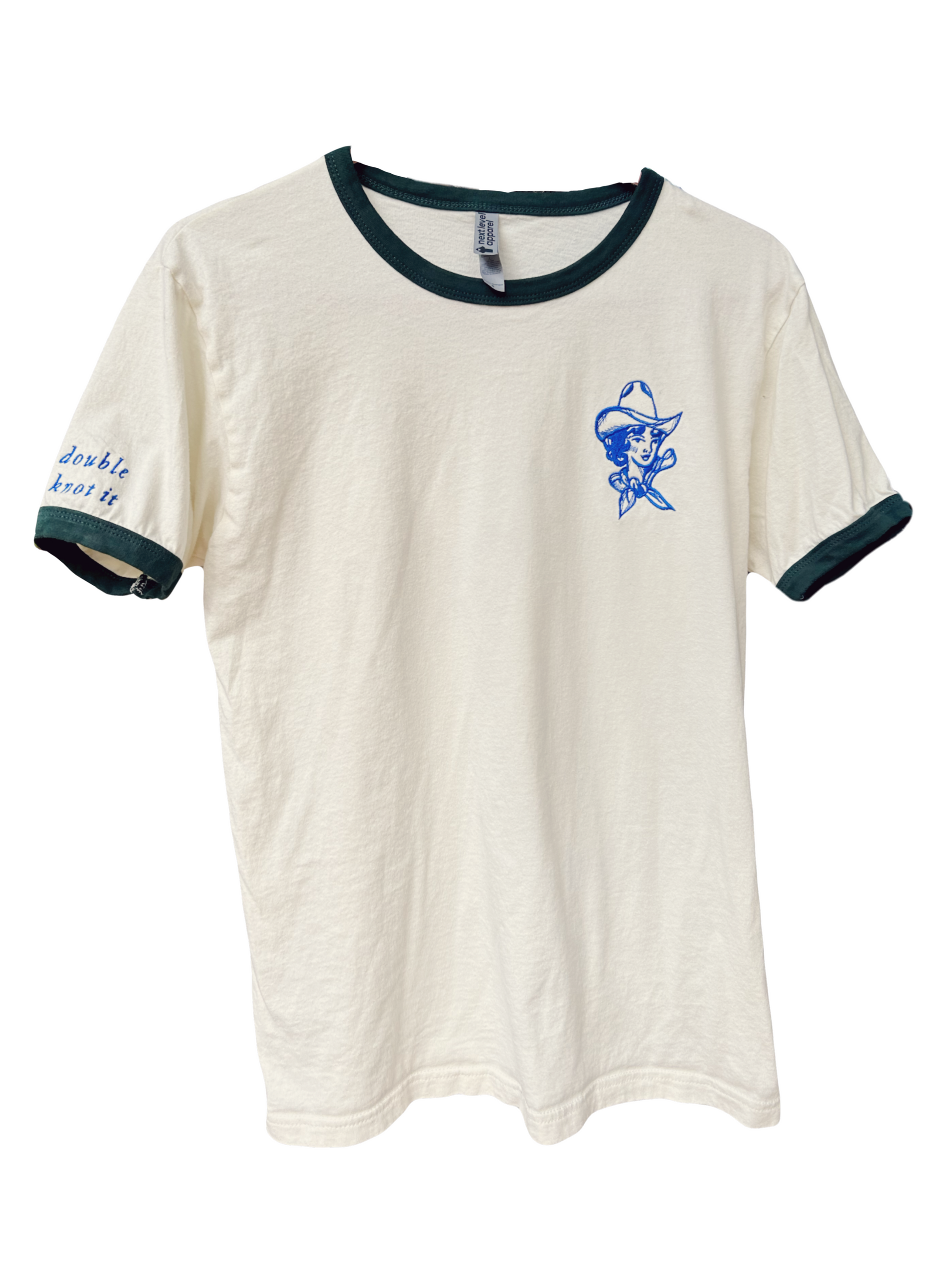 A nod to duality and double assurance. This super-soft, lightweight cream cotton ringer tee features a forest green collar and sleeves, finished with blue embroidery. On the left chest: my hand-drawn cowgirl with a knotted scarf. On the right sleeve: a subtle reminder to “Double Knot It.” Inspired by my double name and the beauty of duality, this tee carries both comfort and meaning.
