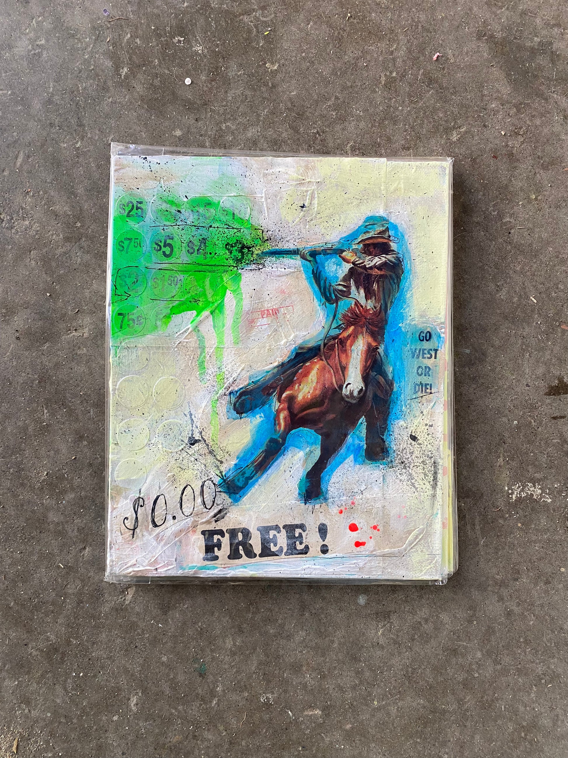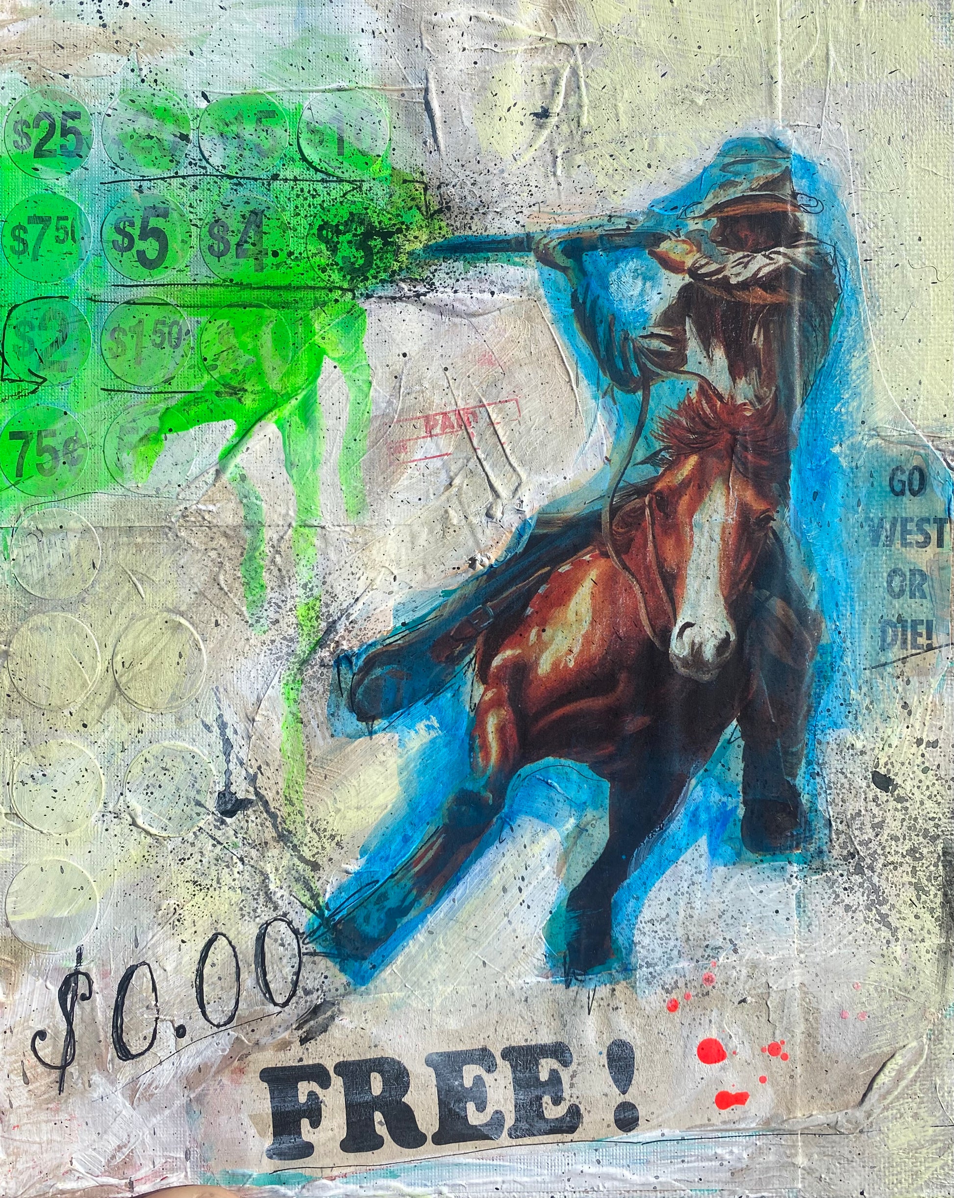 Mixed media on 8x10 board from the "Cash Cowboy" series. Signed on back.