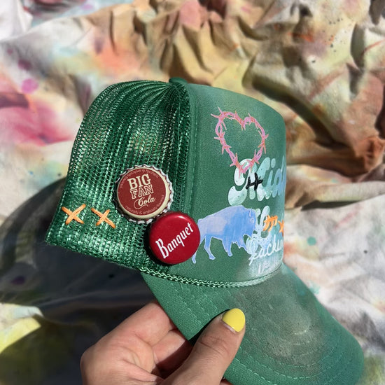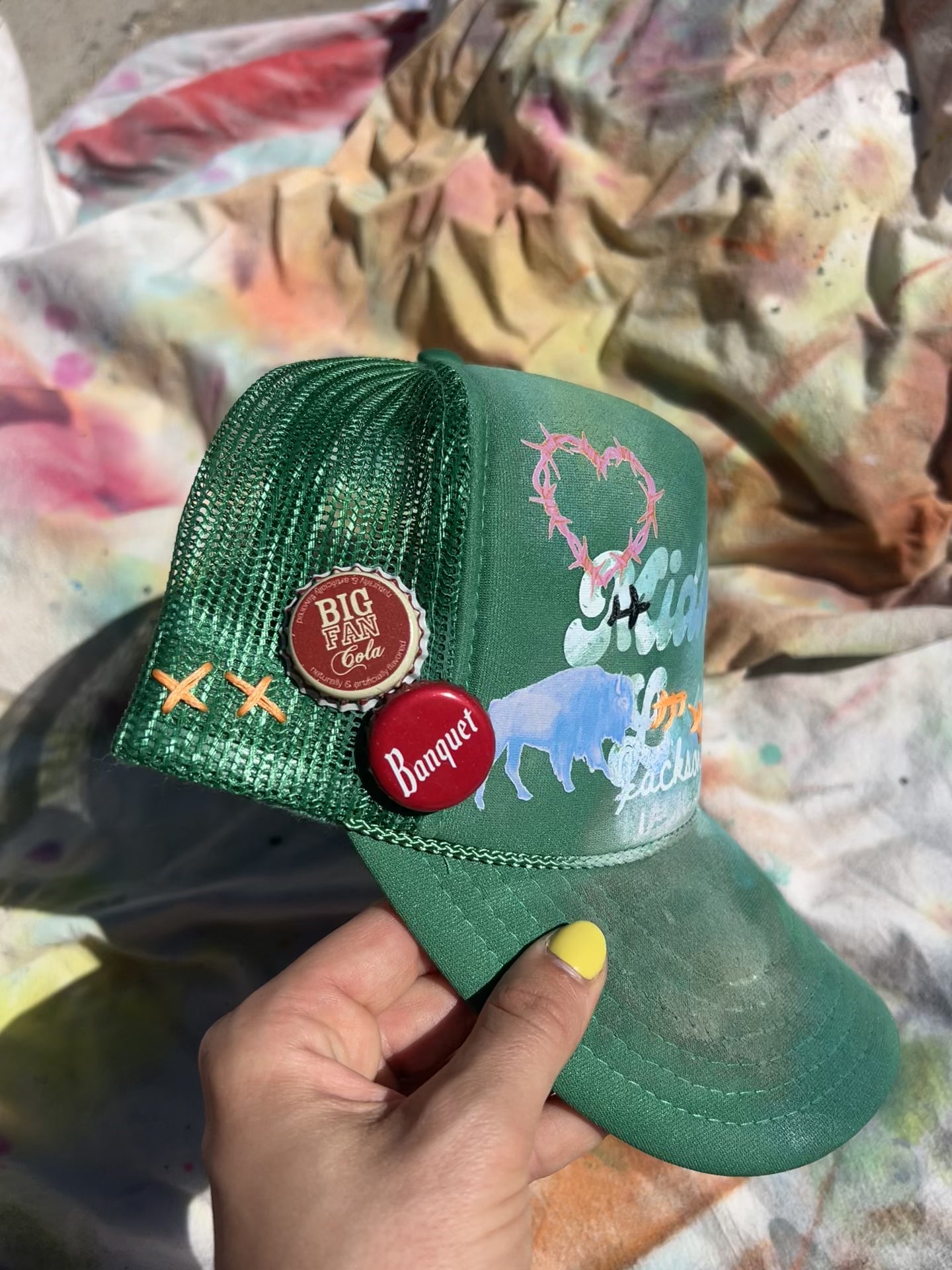 A curated collection of bespoke, upcycled trucker hats—each hand-painted, hand-stitched, and embellished to create bold, one-of-a-kind statement pieces.