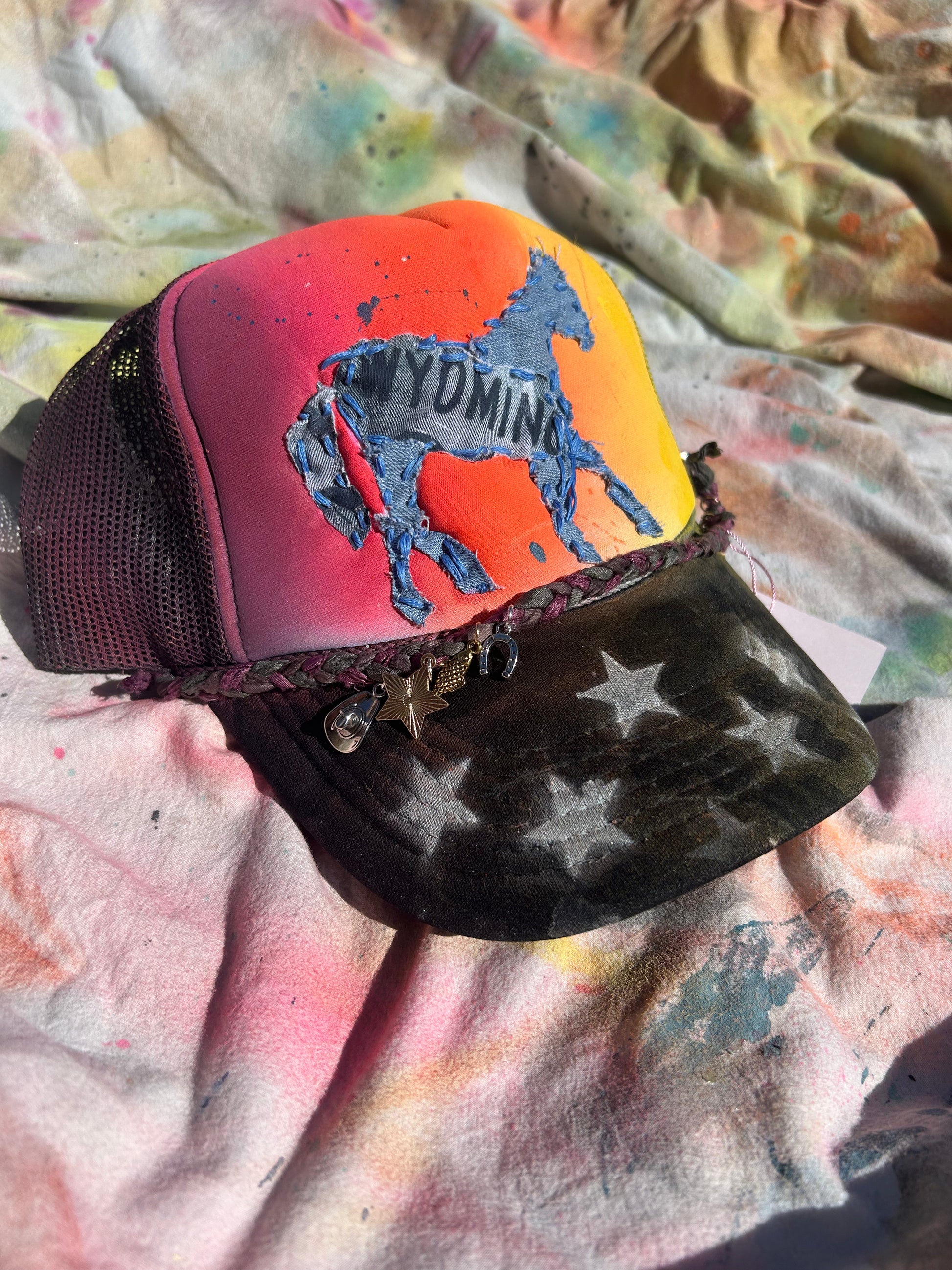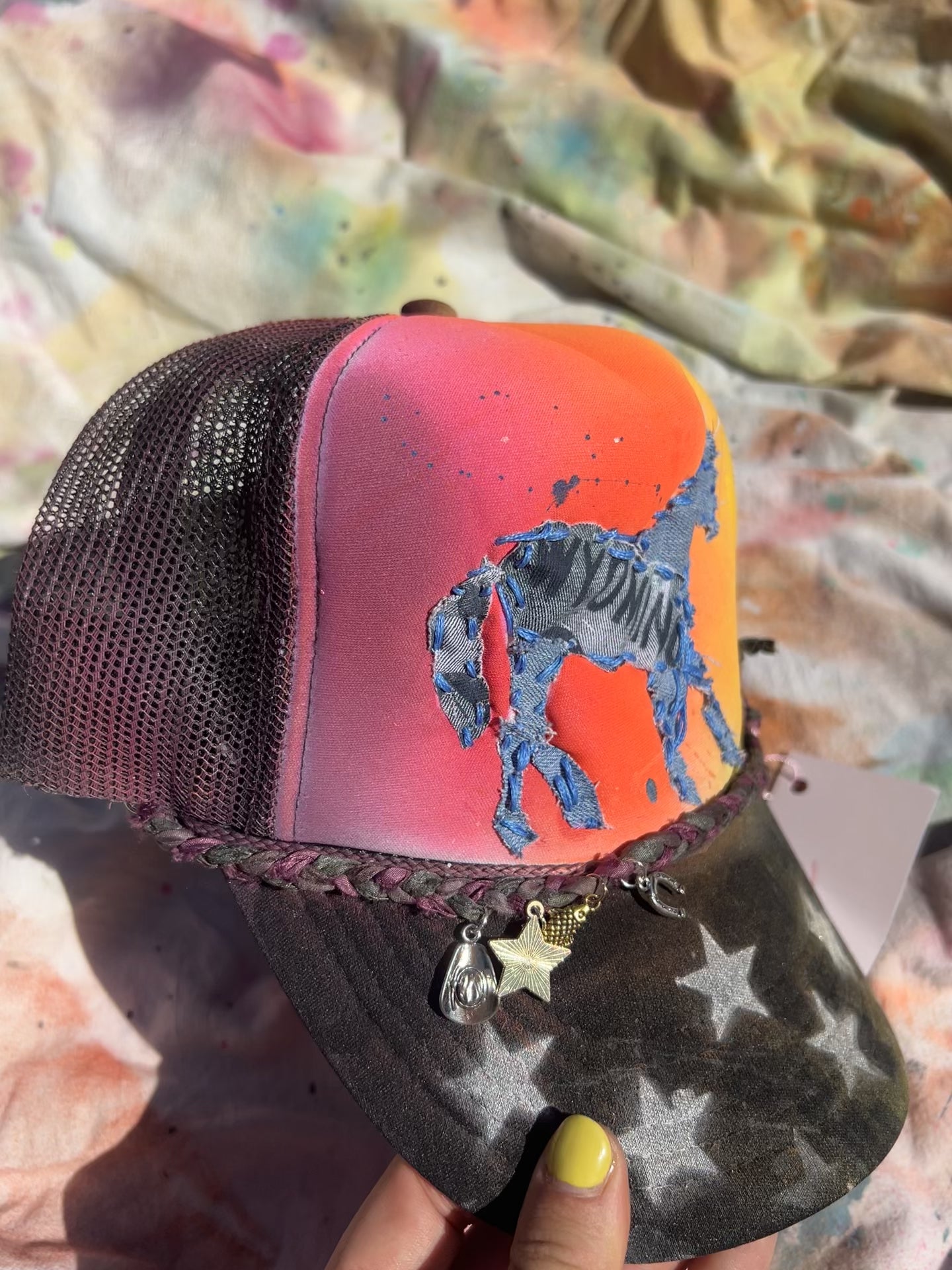A curated collection of bespoke, upcycled trucker hats—each hand-painted, hand-stitched, and embellished to create bold, one-of-a-kind statement pieces.