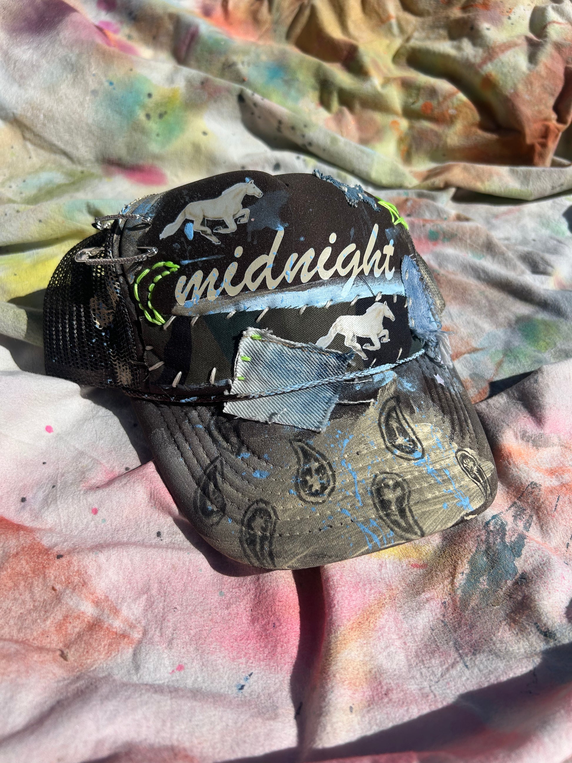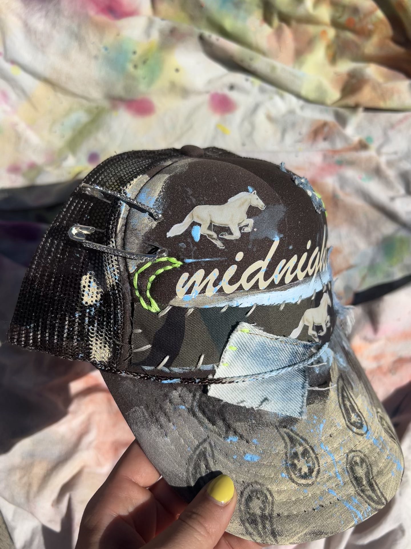 A curated collection of bespoke, upcycled trucker hats—each hand-painted, hand-stitched, and embellished to create bold, one-of-a-kind statement pieces.