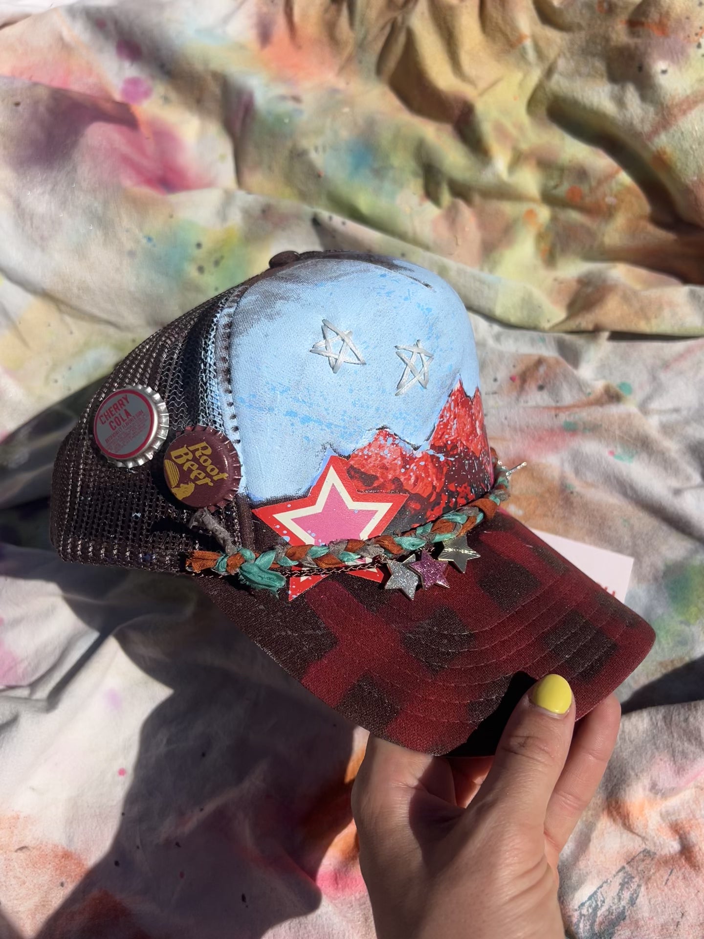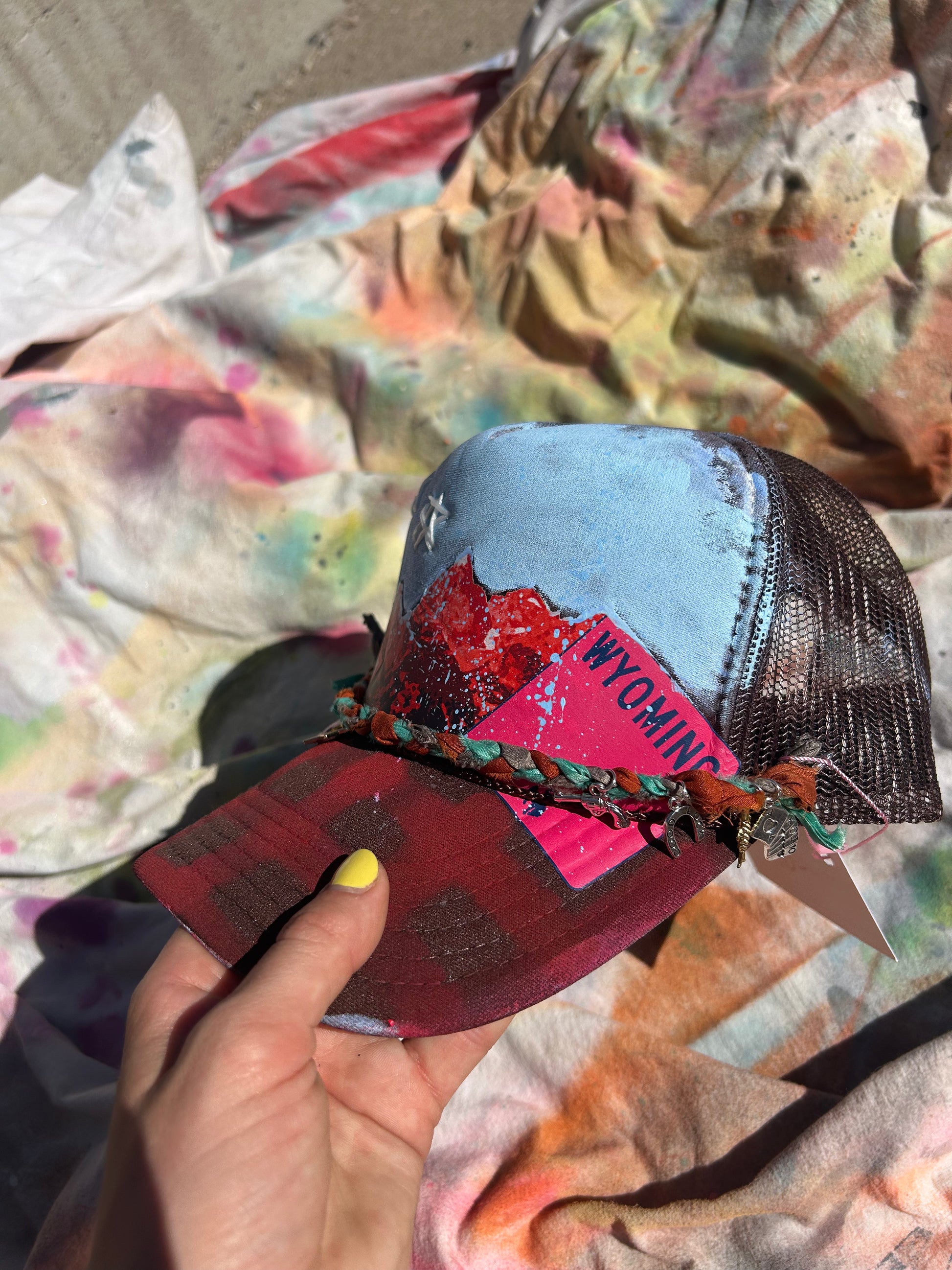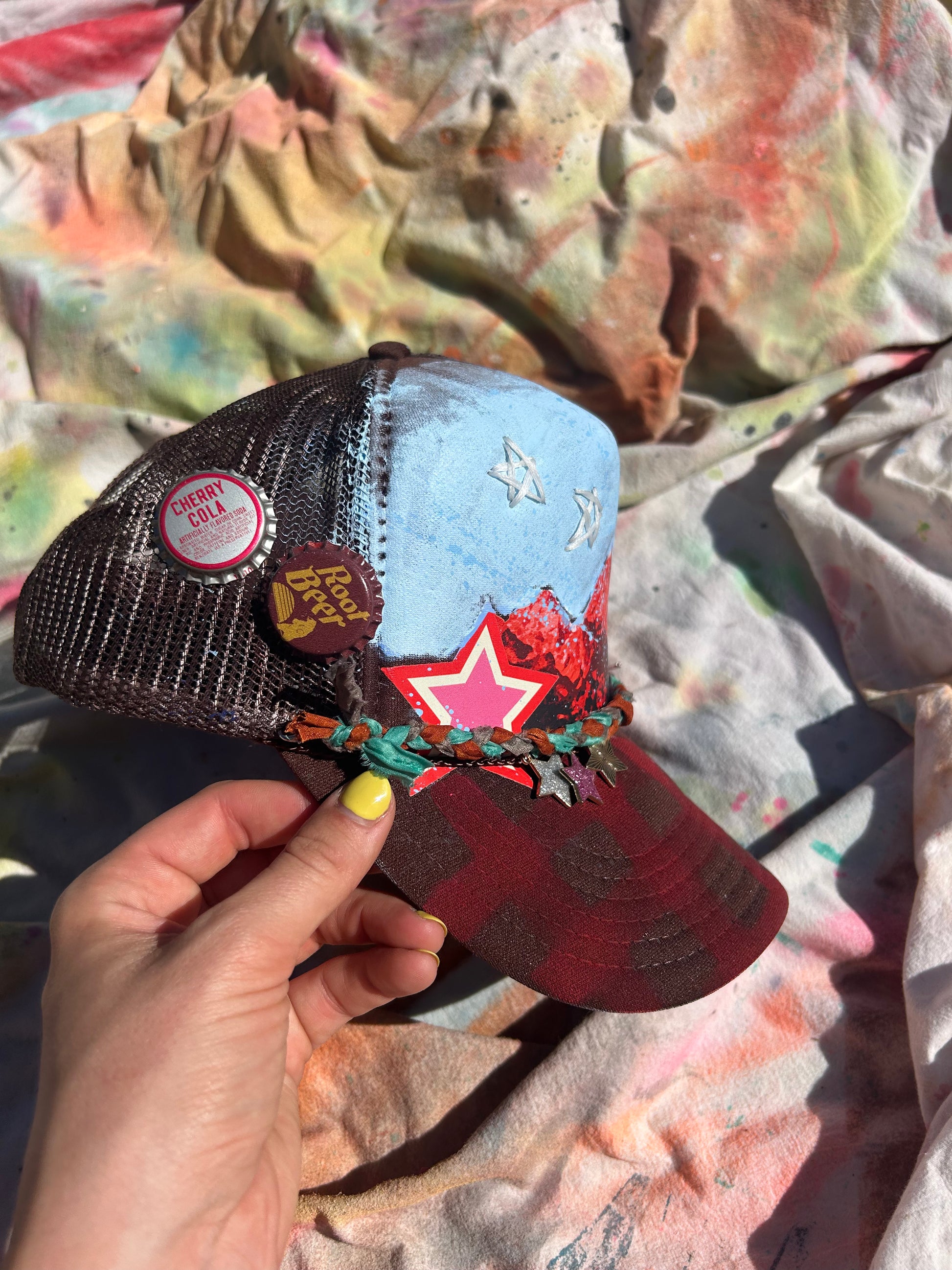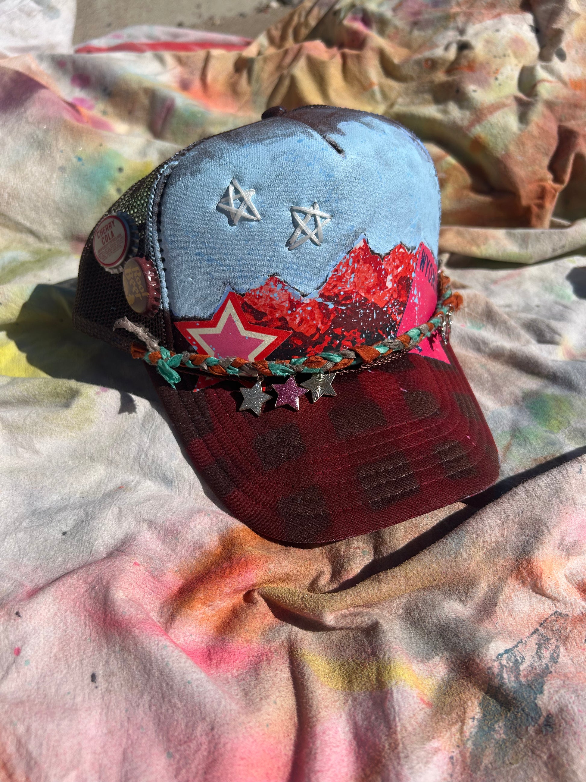 A curated collection of bespoke, upcycled trucker hats—each hand-painted, hand-stitched, and embellished to create bold, one-of-a-kind statement pieces.