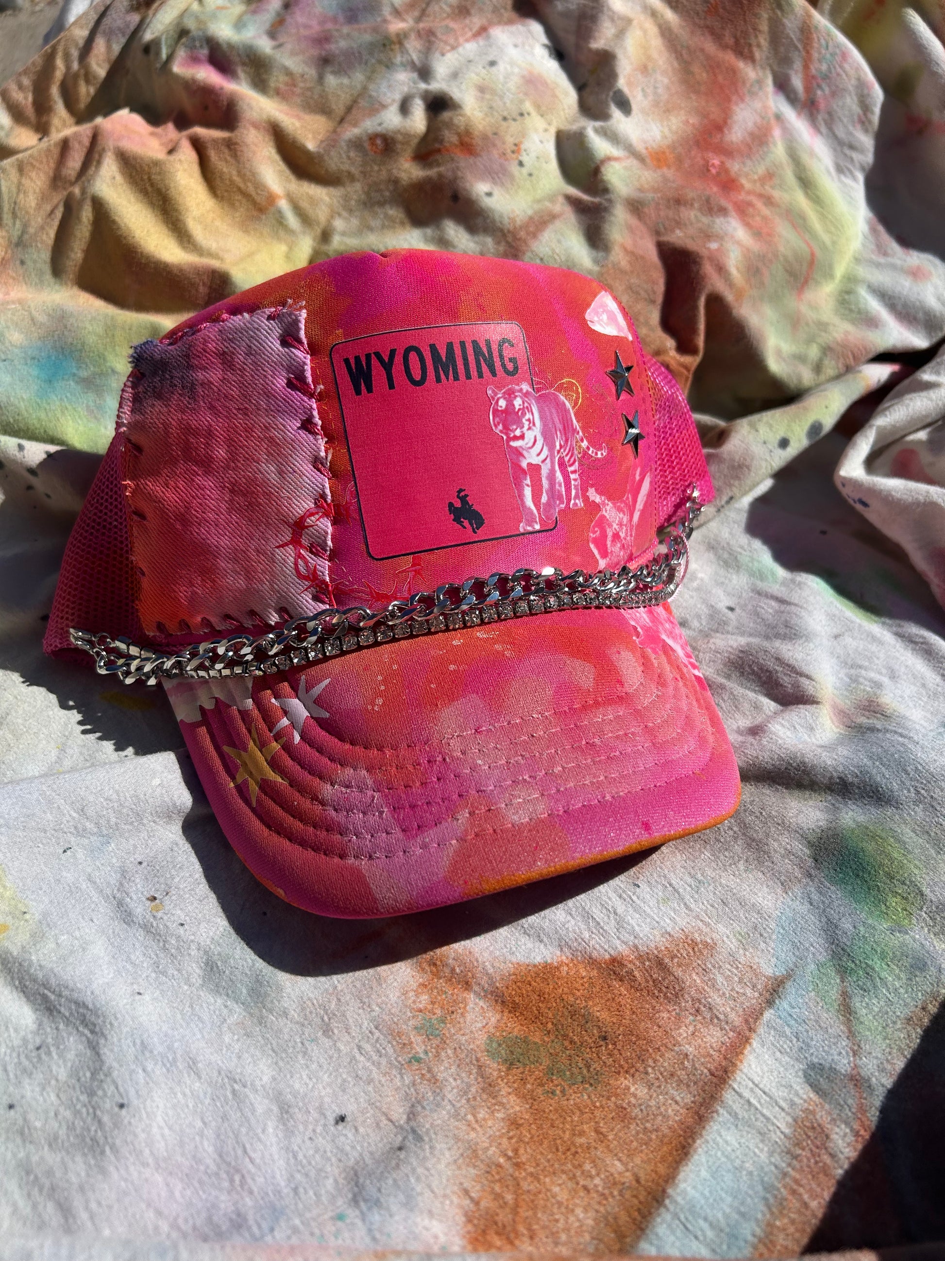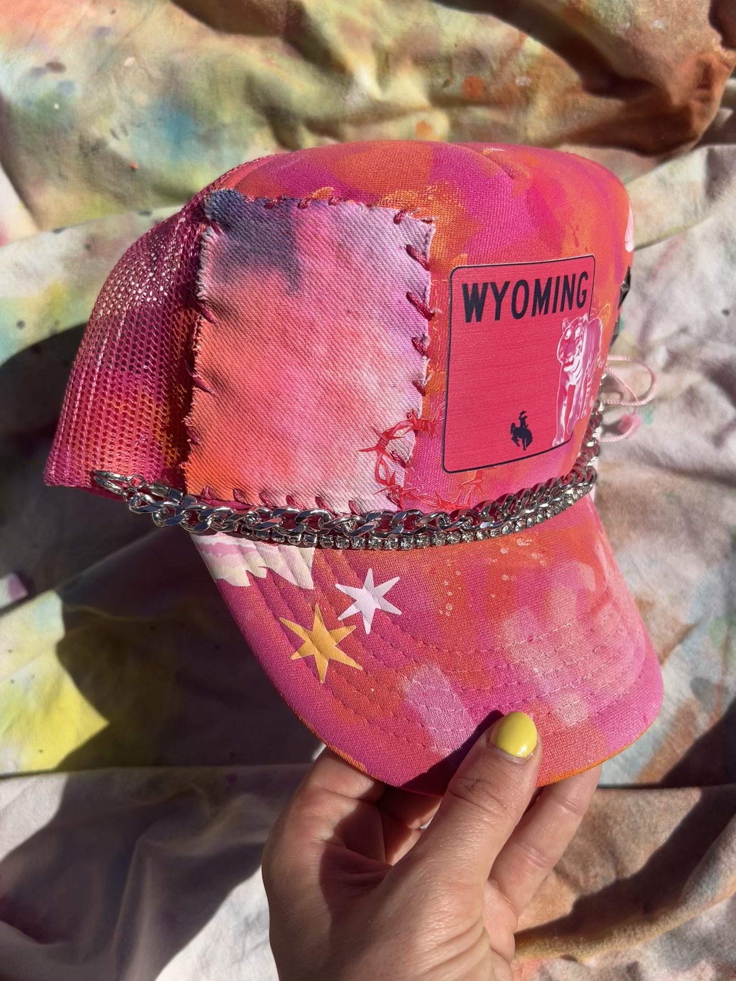 A curated collection of bespoke, upcycled trucker hats—each hand-painted, hand-stitched, and embellished to create bold, one-of-a-kind statement pieces.