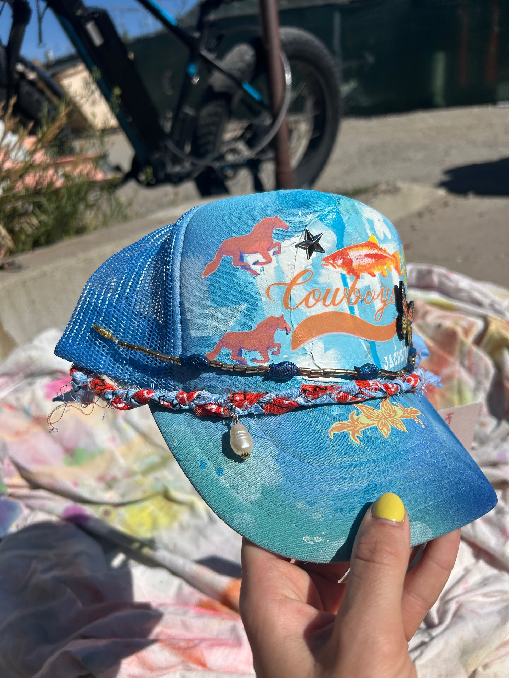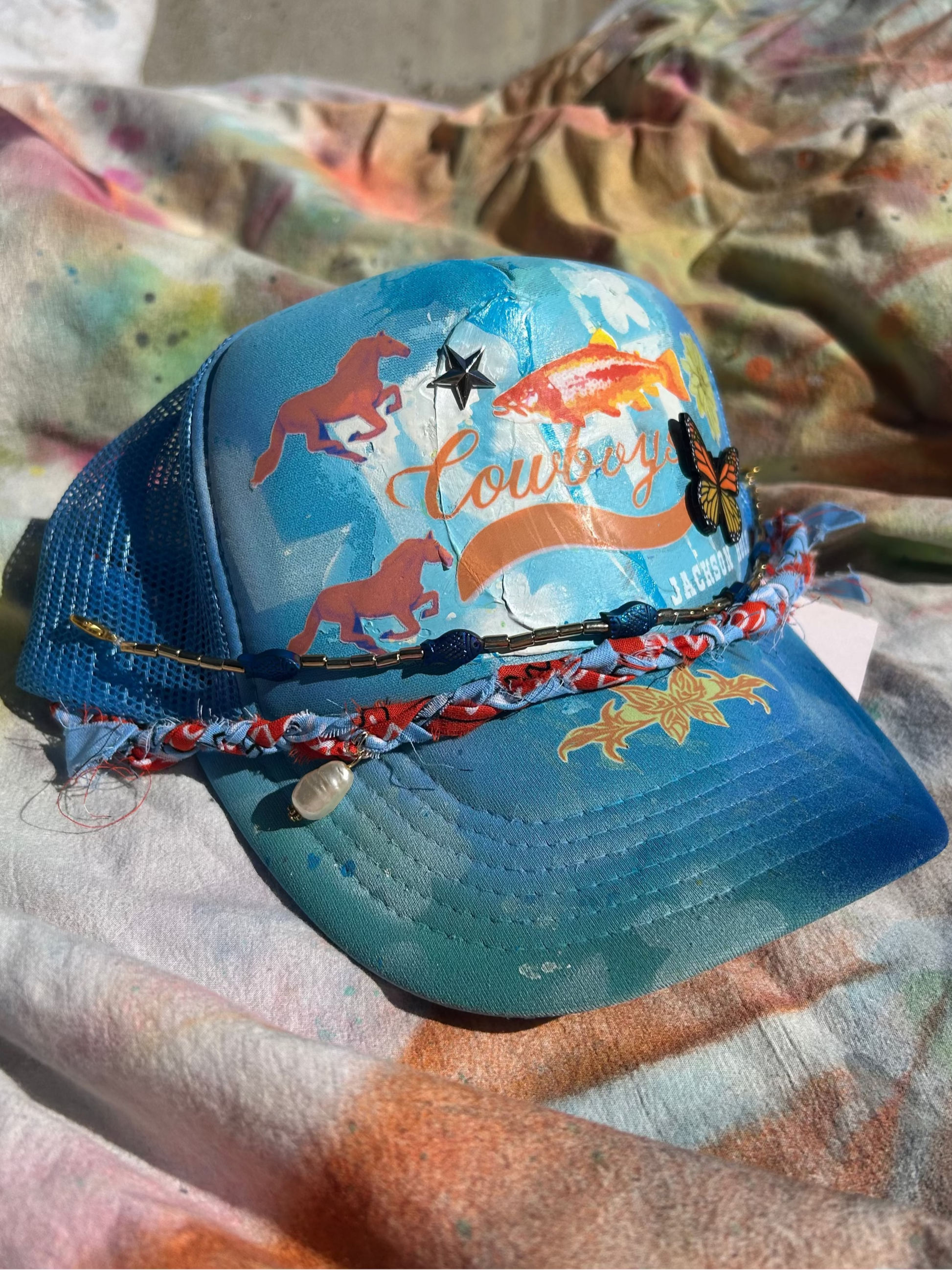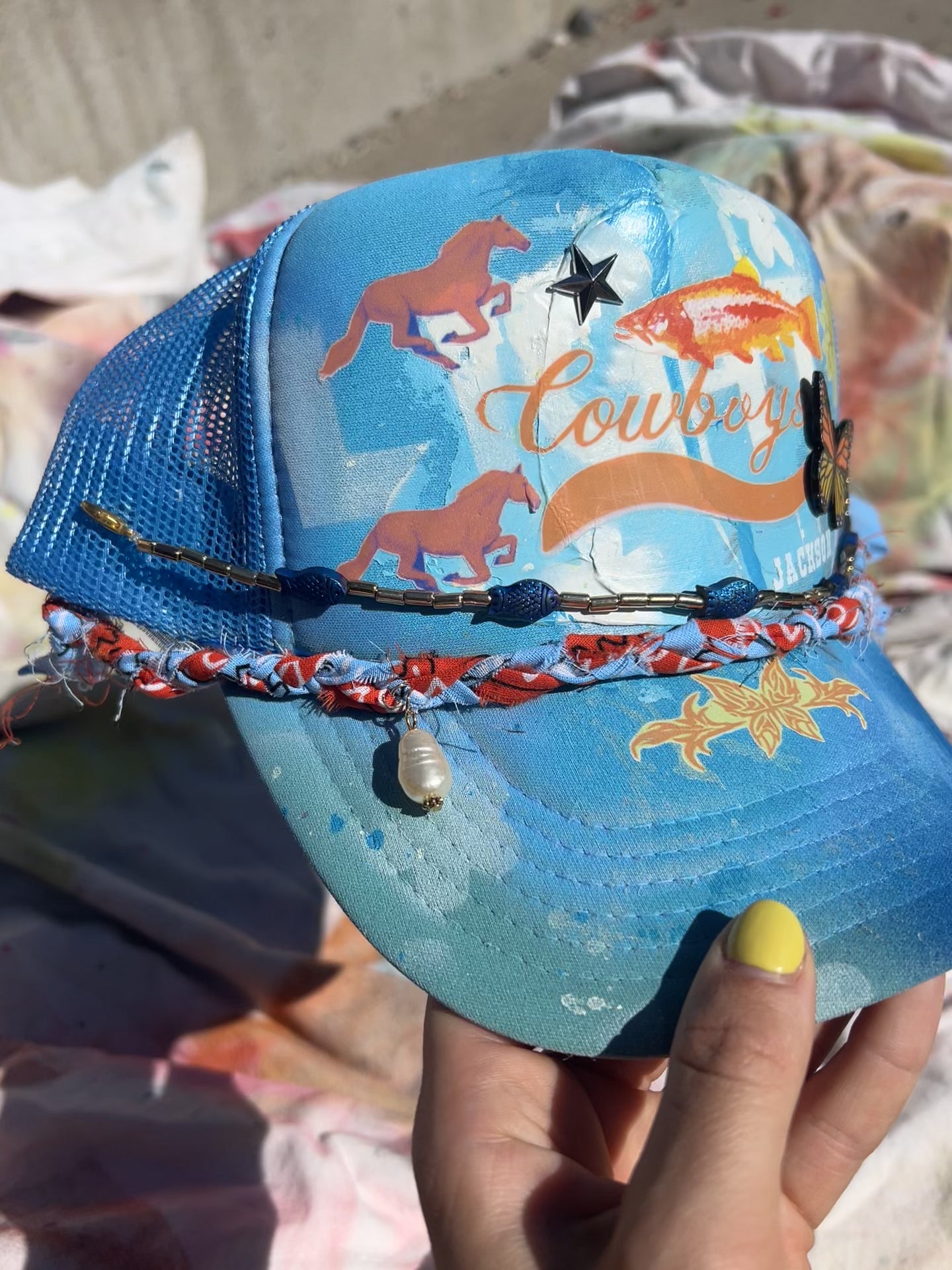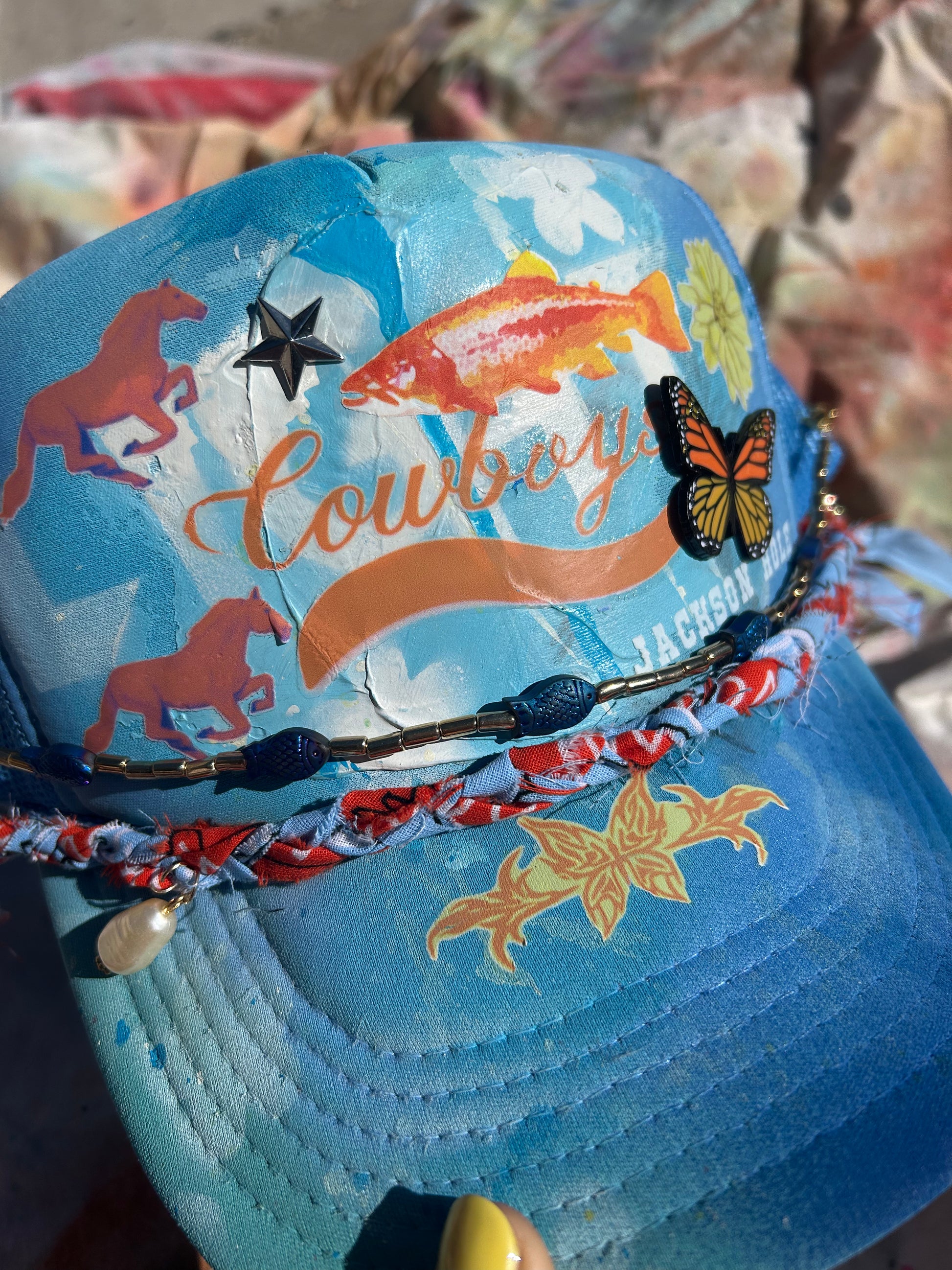 A curated collection of bespoke, upcycled trucker hats—each hand-painted, hand-stitched, and embellished to create bold, one-of-a-kind statement pieces.
