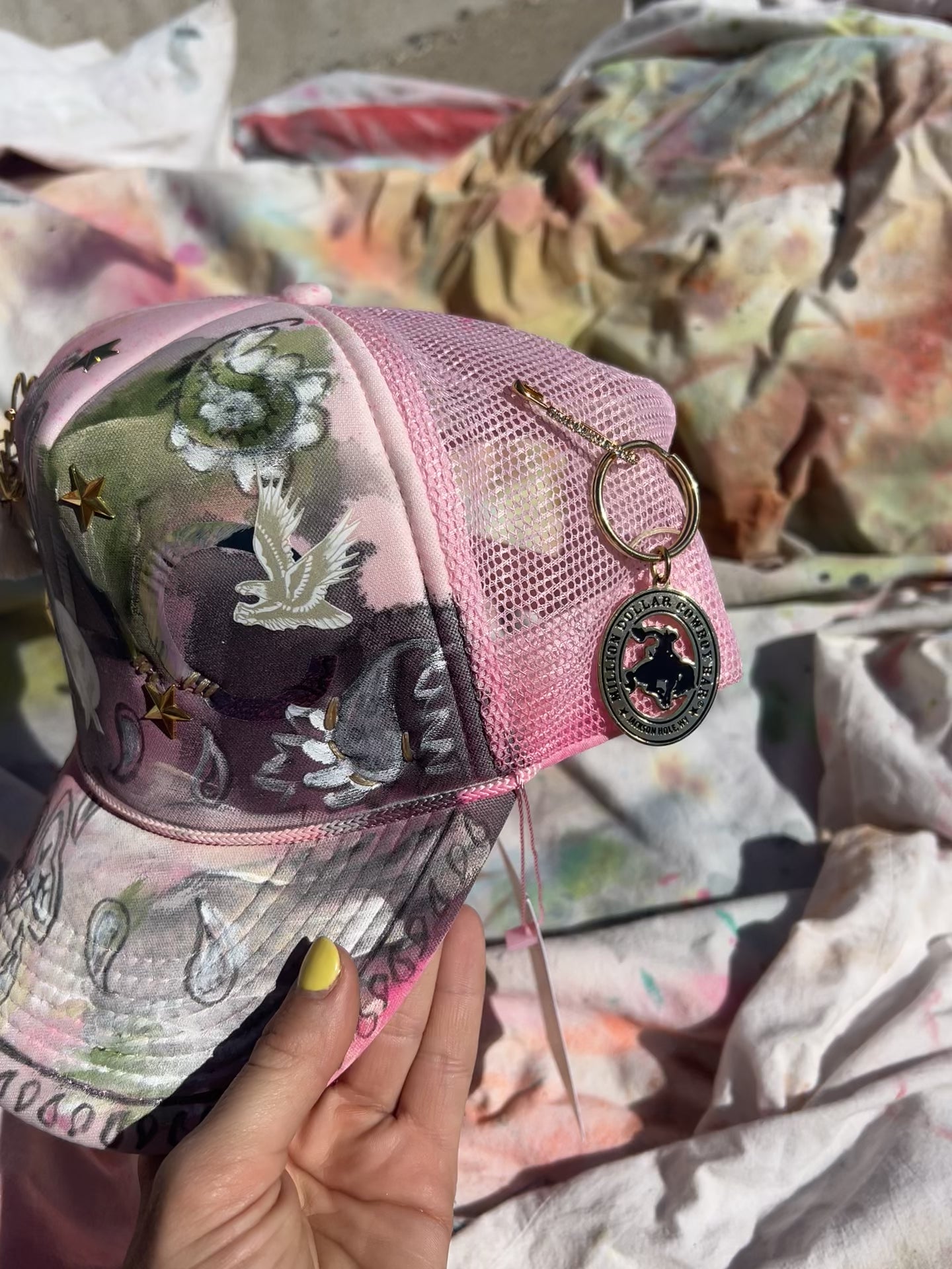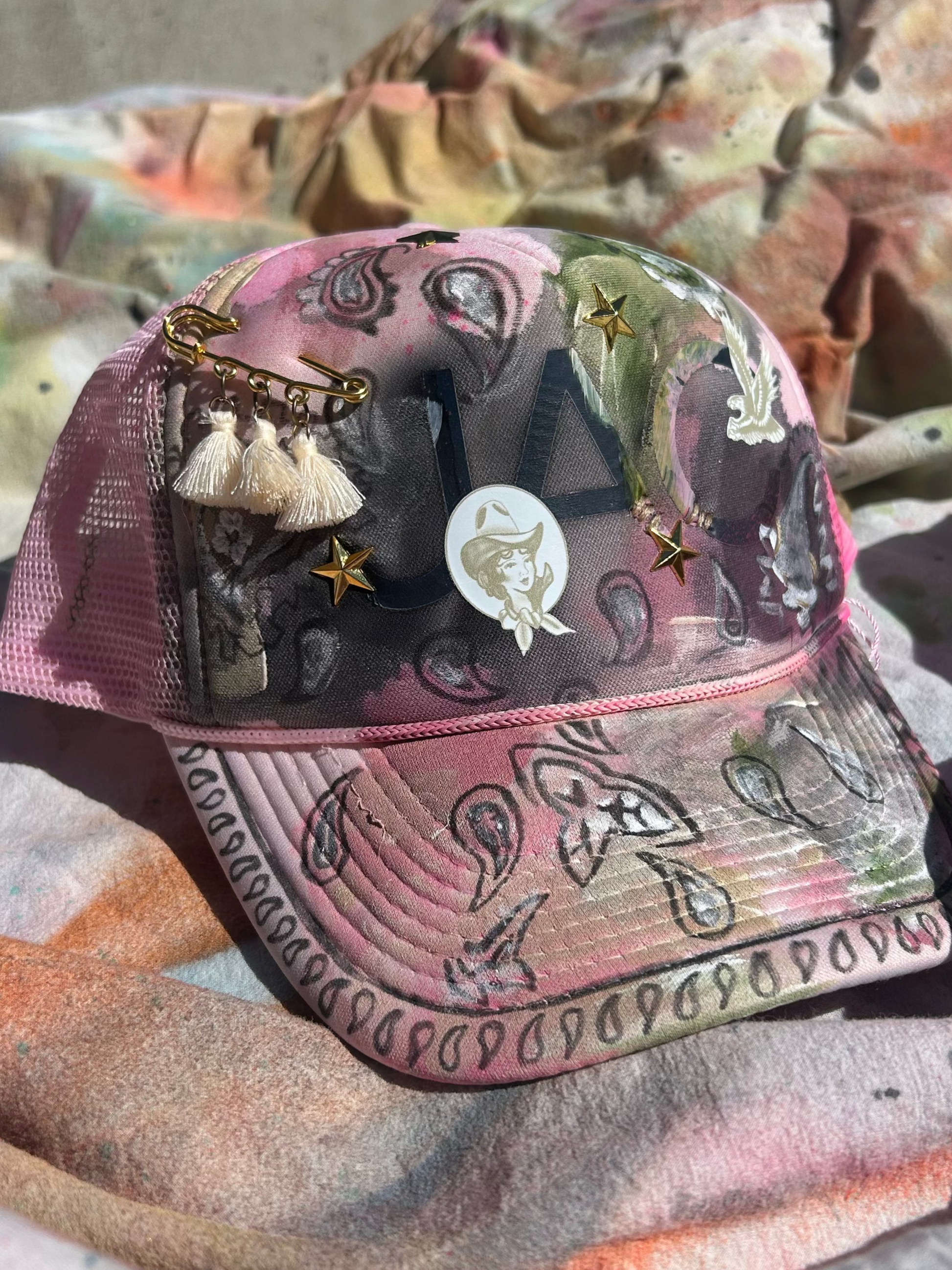 A curated collection of bespoke, upcycled trucker hats—each hand-painted, hand-stitched, and embellished to create bold, one-of-a-kind statement pieces.