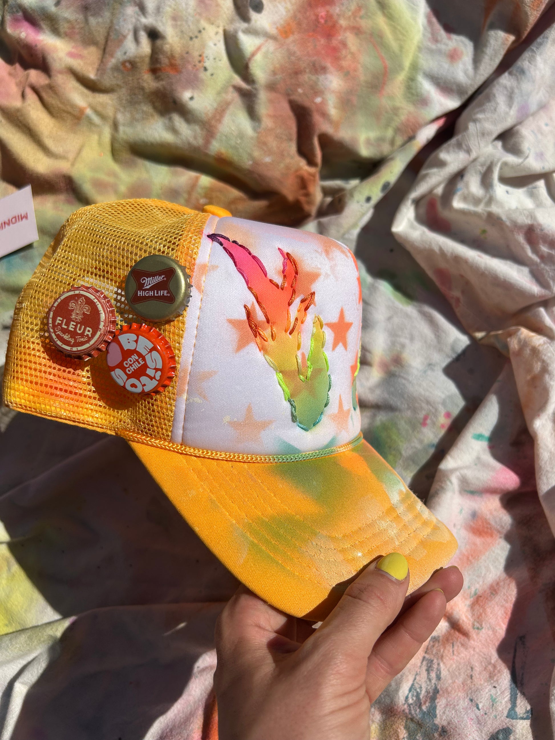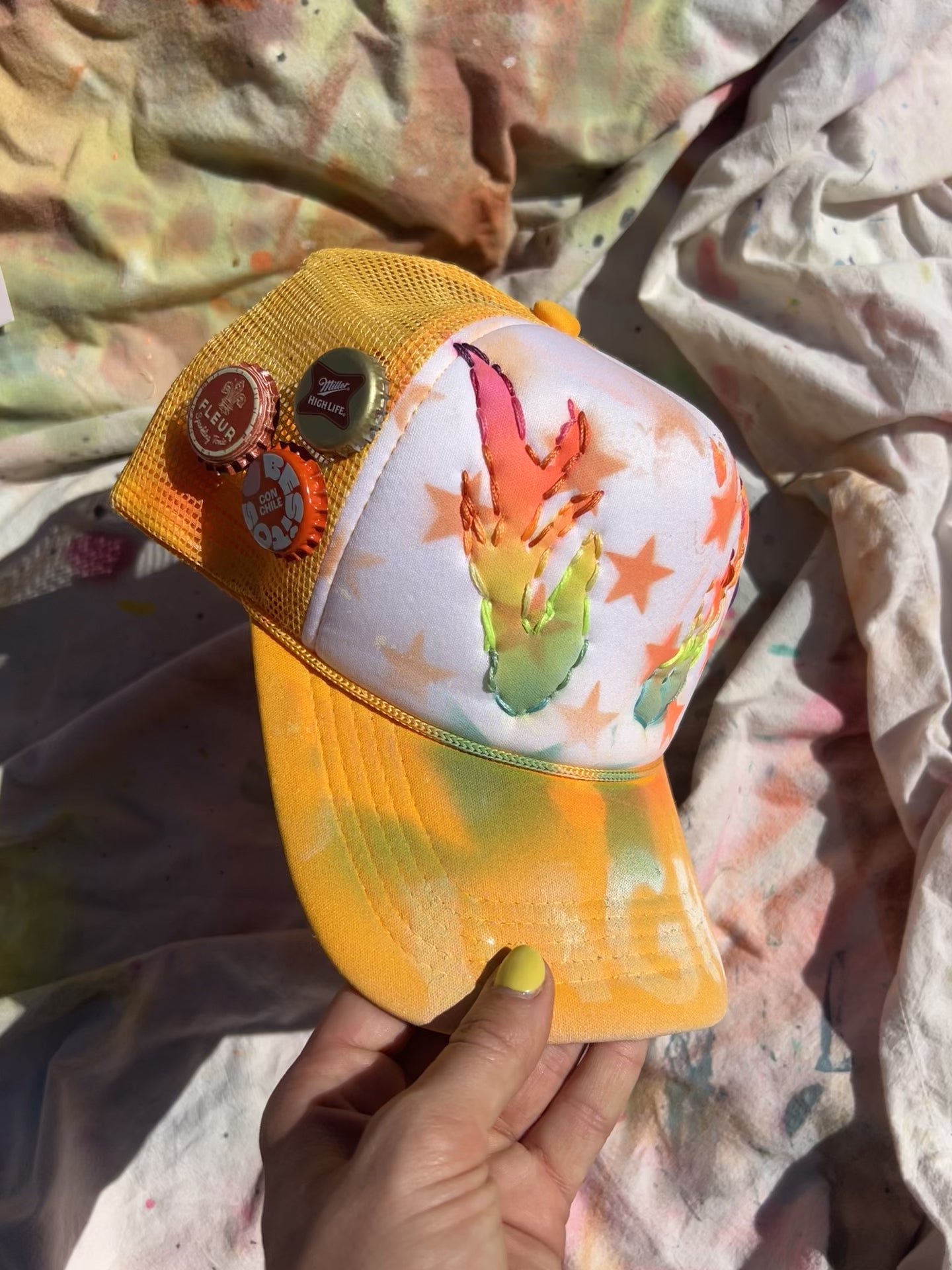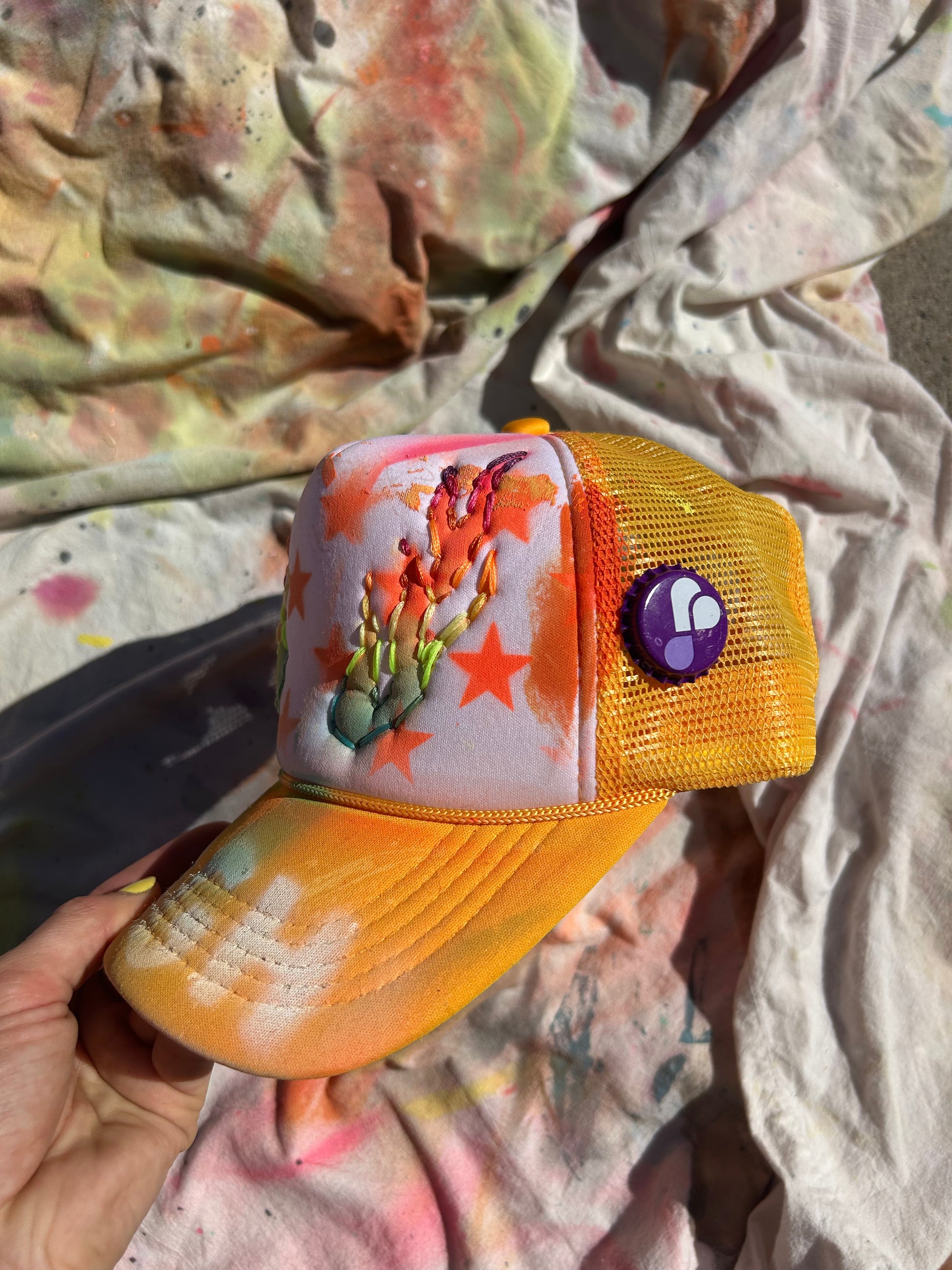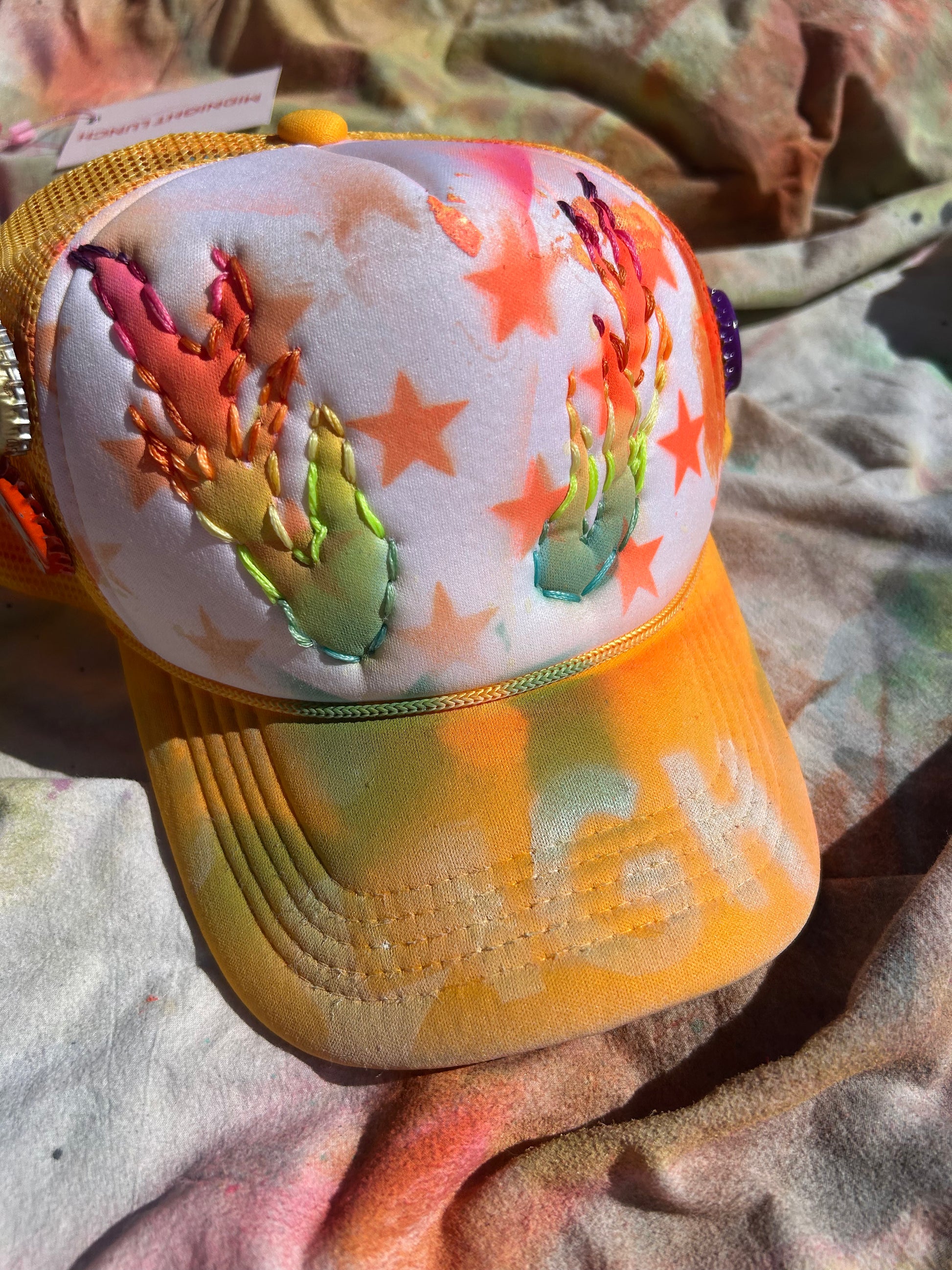 A curated collection of bespoke, upcycled trucker hats—each hand-painted, hand-stitched, and embellished to create bold, one-of-a-kind statement pieces.