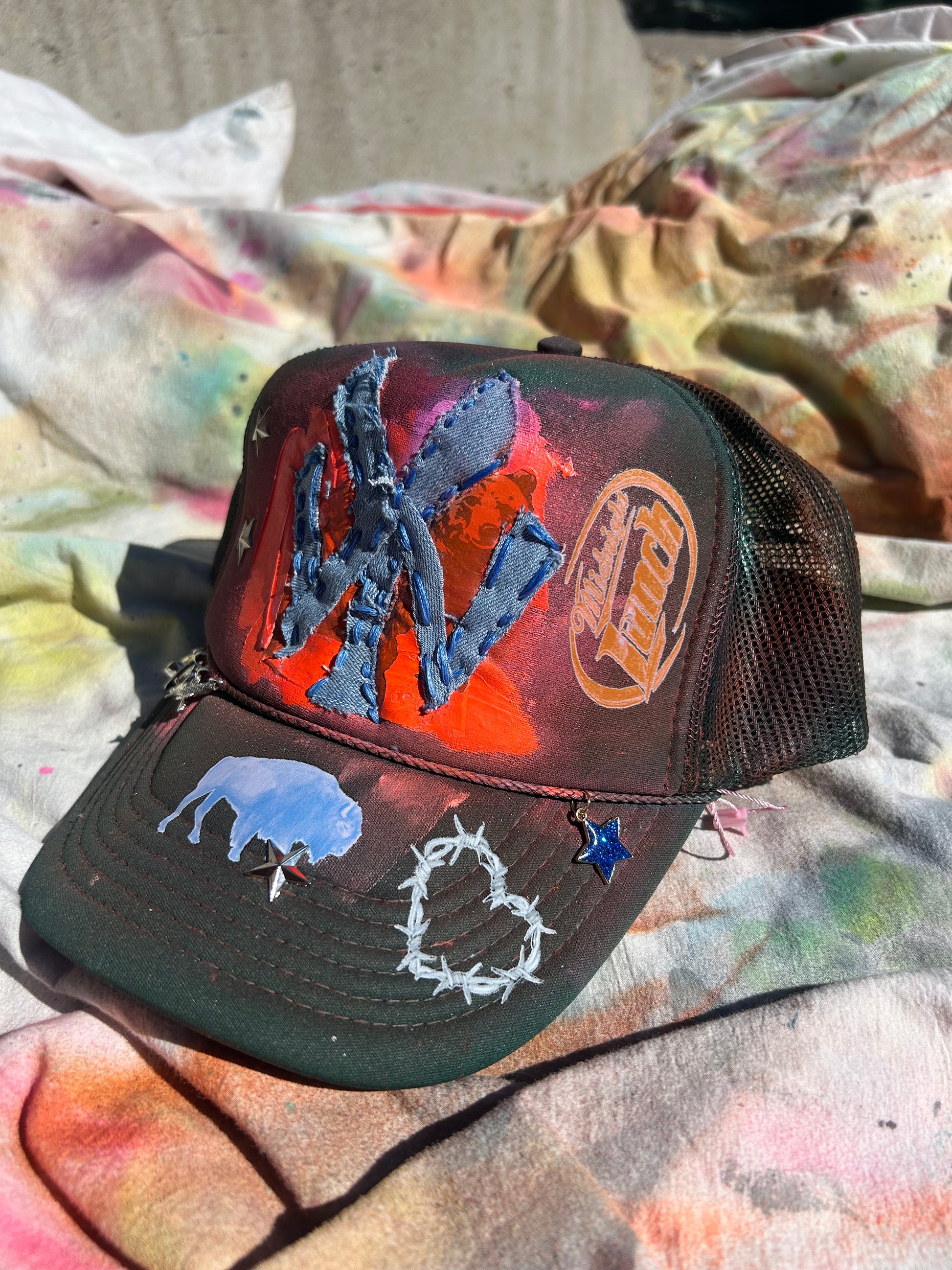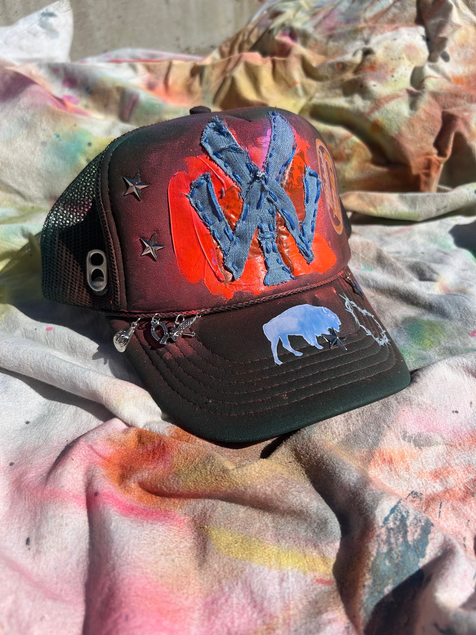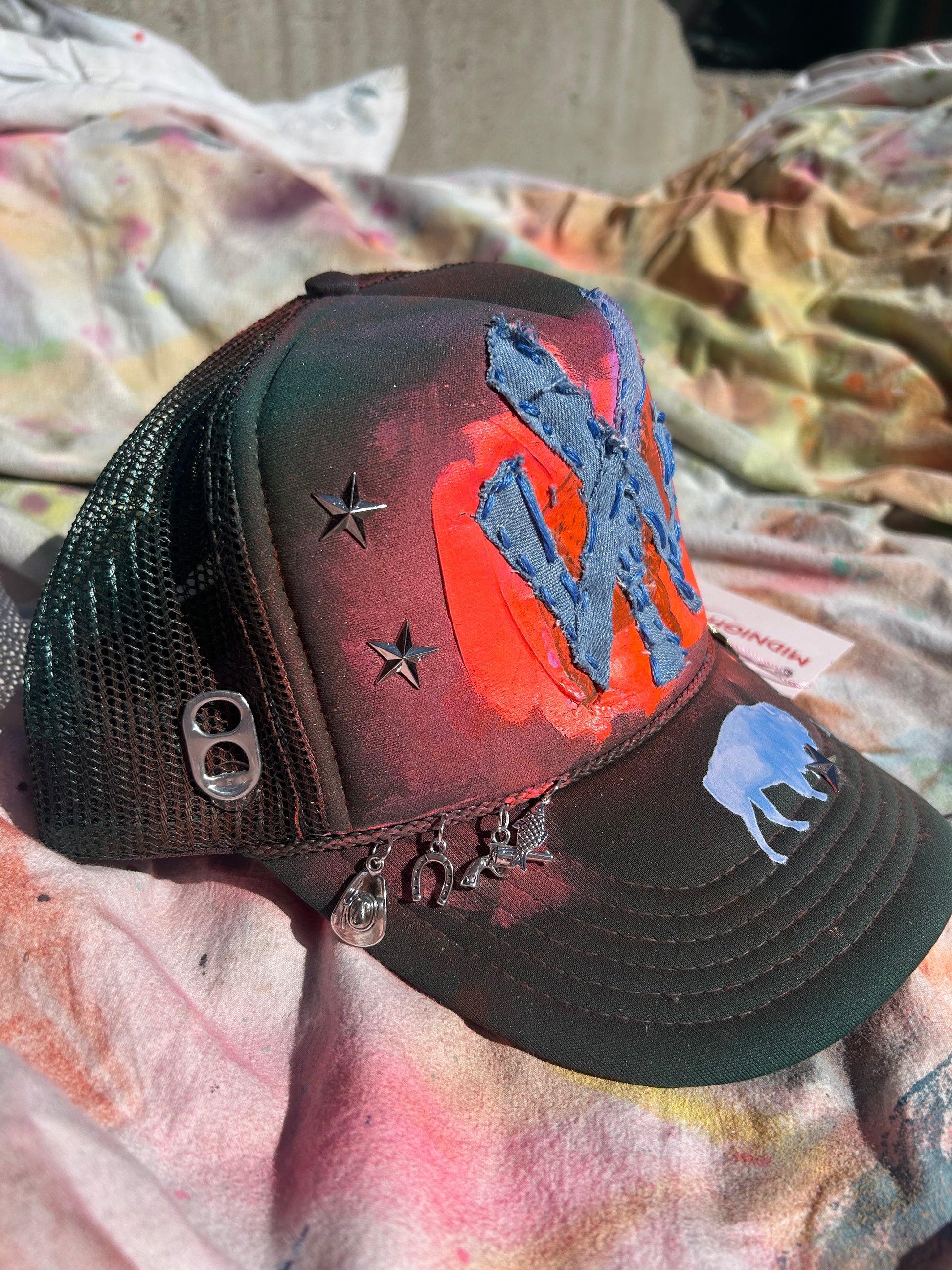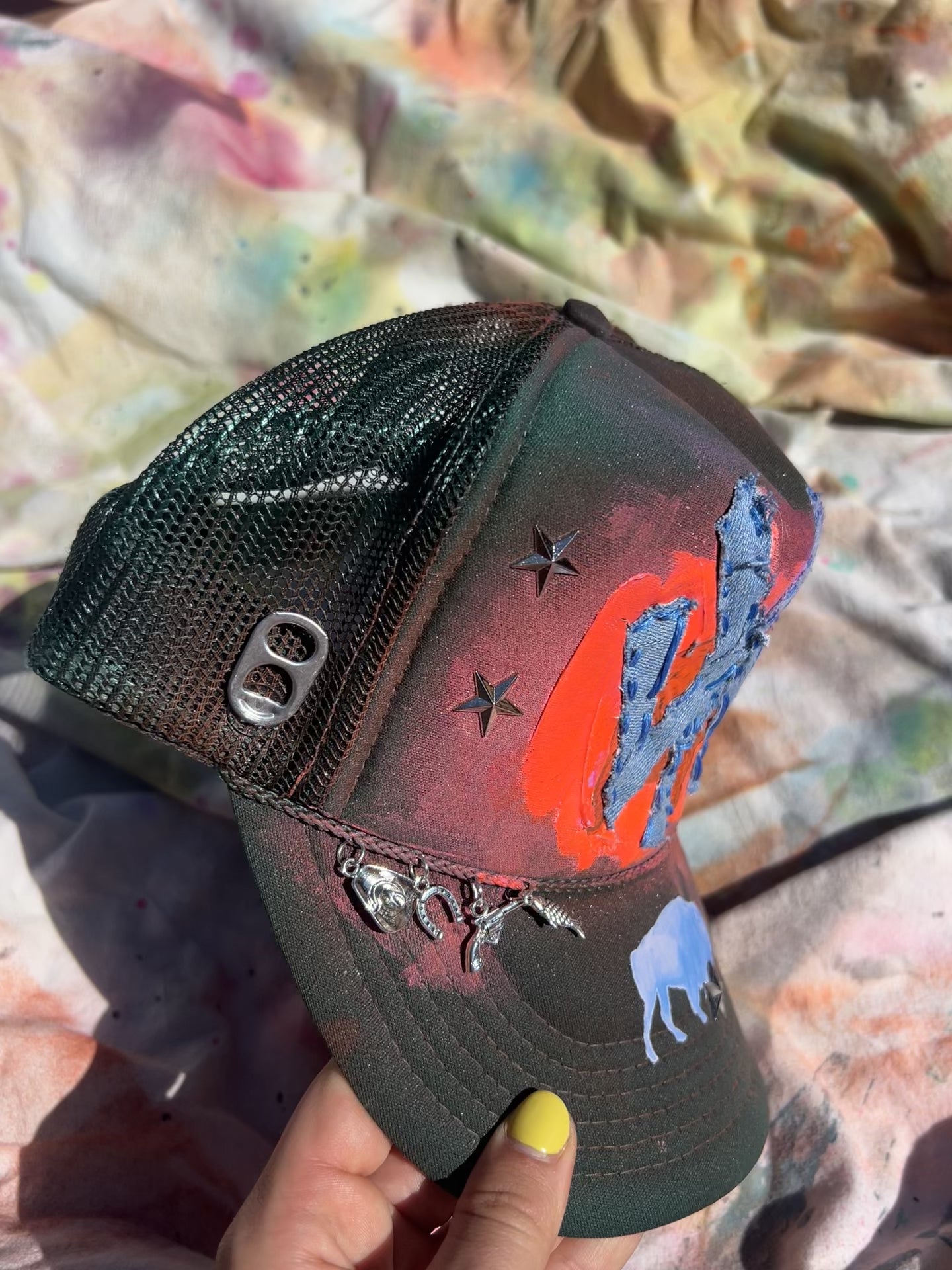A curated collection of bespoke, upcycled trucker hats—each hand-painted, hand-stitched, and embellished to create bold, one-of-a-kind statement pieces.